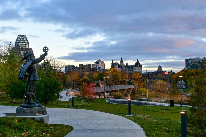 В новом контексте на мысе Кивекки памятник призван подчеркнуть традиционное значение реки Кичи-Зиби (Оттава) для путешествий и торговли – двух приоритетов Самюэля де Шамплейн. Шамплейн изображен с астролябией – европейским навигационным инструментом. Он также призван показать, как прибытие пришельцев с другого берега Атлантического океана в этот древний ландшафт вызвало волну изменений, которые продолжают оказывать влияние и по сей день →