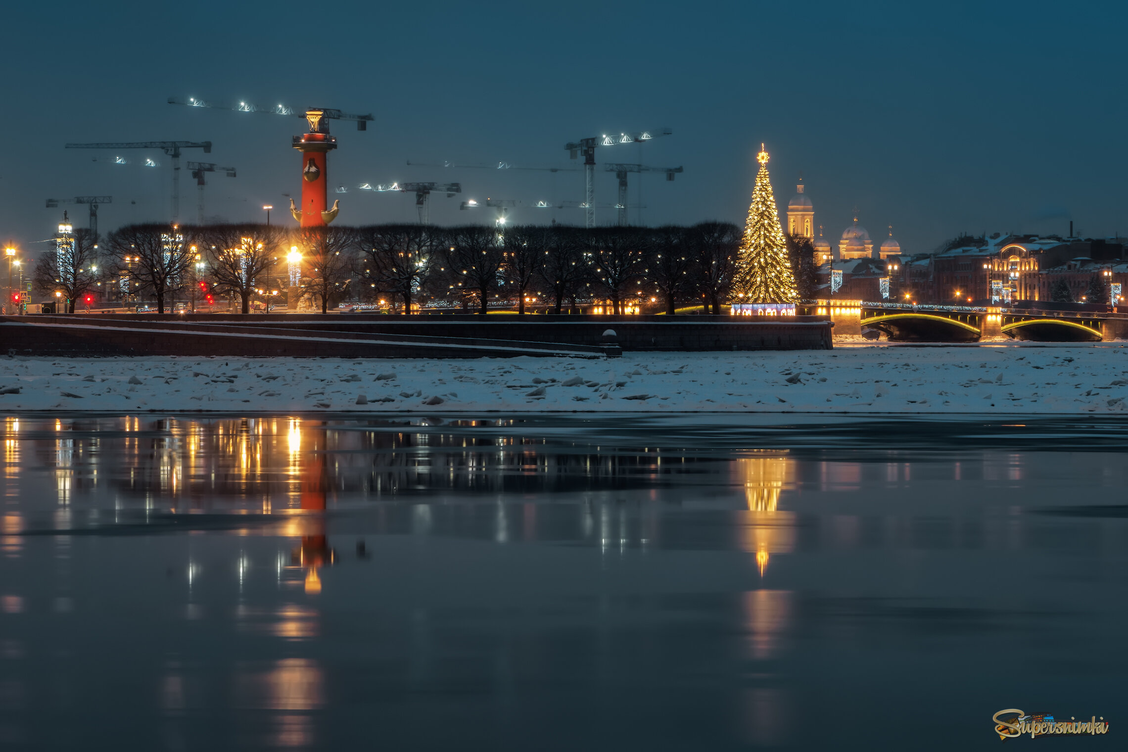 Зимний утренний вид через Стрелку ВО на Петроградку с Дворцовой набережной