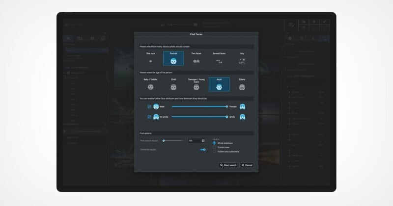 AI-движок Excire X-tetics также оценивает изображения по общим фотографическим элементам, таким как композиция и экспозиция. Функции поиска по людям могут определять лицевые характеристики, такие как возраст и пол, для анализа изображений и присвоения меток. Кроме того, управление изображениями включает возможность редактирования GPS-метаданных.
