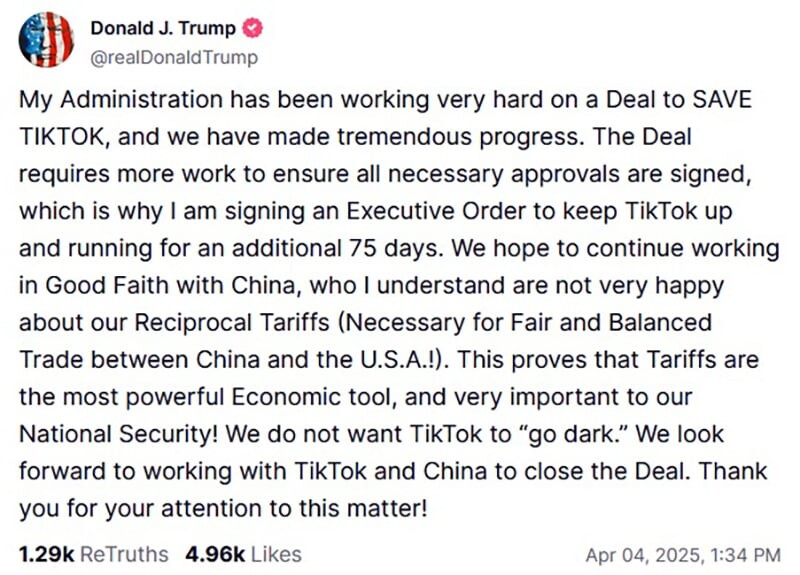 После сообщения о необходимости больше времени для завершения сделки, Трамп анонсировал вторую отсрочку, продливши срок на 75 дней через свою платформу Truth Social, отметив, что сделка потребует дополнительной работы для получения всех необходимых одобрений.