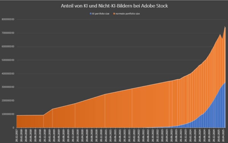 Кнешке отмечает, что в мае 2023 года на Adobe Stock было 8,5 миллиона AI-изображений, что составило 2,5 процента от общего объёма на тот момент. Однако, если заглянуть в будущее, за два года это число увеличилось в 40 раз, и по данным Кнешке, на апрель 2025 года на Adobe Stock было доступно 313 миллионов AI-изображений и 342 миллиона настоящих фотографий — всего на 29 миллионов меньше, чтобы достичь равенства 50/50.
