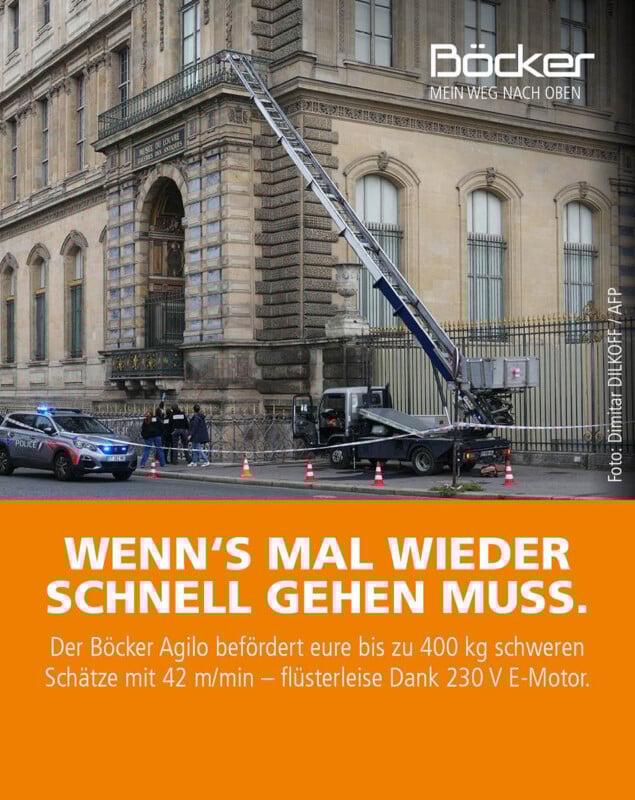 Как известно, "плохая реклама - тоже реклама", и компания Böcker явно согласна с этой идеей. После того, как одно из их подъемных приспособлений было зафиксировано на фото, сделанном во время ограбления Лувра, Böcker решила использовать этот момент для создания вирусной рекламной кампании.