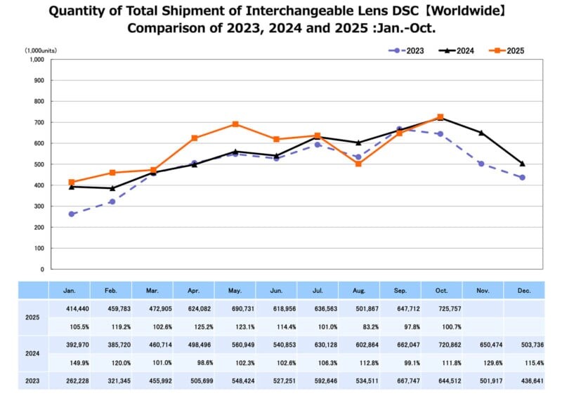 Общие поставки цифровых камер резко увеличились с августа по сентябрь и вновь с сентября по октябрь, что делает октябрь 2025 года самым лучшим месяцем для поставок камер с начала 2023 года. За исключением августа, поставки цифровых камер в этом году были выше, чем в любые из двух предыдущих лет. В 2024 году наблюдалось первое увеличение поставок цифровых камер в годовом исчислении с 2017 года.