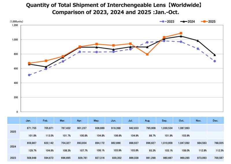 Что касается объективов, производители CIPA в октябре отгрузили 1,087,993 единицы, что выше, чем 1,030,534 в сентябре и 795,008 в августе. Этот показатель стал самым высоким для поставок сменных объективов с начала 2023 года.