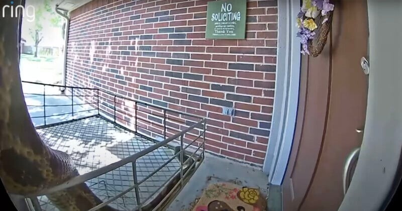 Жительница города Сайпресс, штат Техас, испытала удивление, когда её камера дверного звонка запечатлела неожиданного гостя – большого змея, ползущего возле её дома.