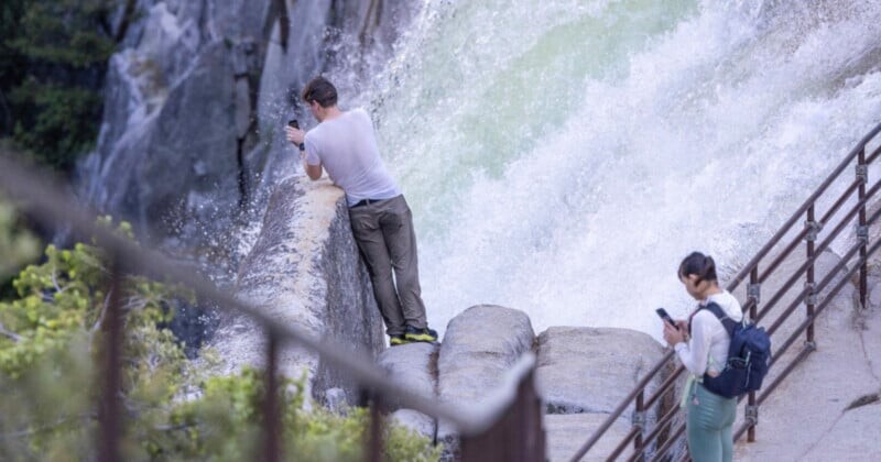 Недавнее фото, распространившееся на Reddit, запечатлело момент, когда турист, перескочивший через ограждение безопасности, приблизился к краю водопада Вернал в национальном парке Йосемити, чтобы сделать снимок на свой телефон. На фотографии видно, как он опирается на скалы всего в нескольких метрах от 96-метрового обрыва.