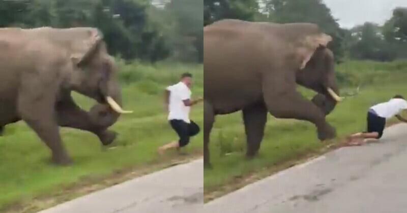 Турист попытался убежать, но слон быстро догнал его. Мужчина упал, пытаясь спастись, и слон прижал его к дороге ногой, прежде чем затоптать его.