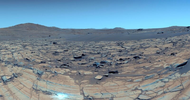 Лаборатория реактивного движения NASA (JPL) создала 360-градусную панораму из 96 изображений, где цвет был улучшен для создания обманчиво голубого неба, которое выглядит непривычно заманчиво для Марса с его средней температурой -63°C.