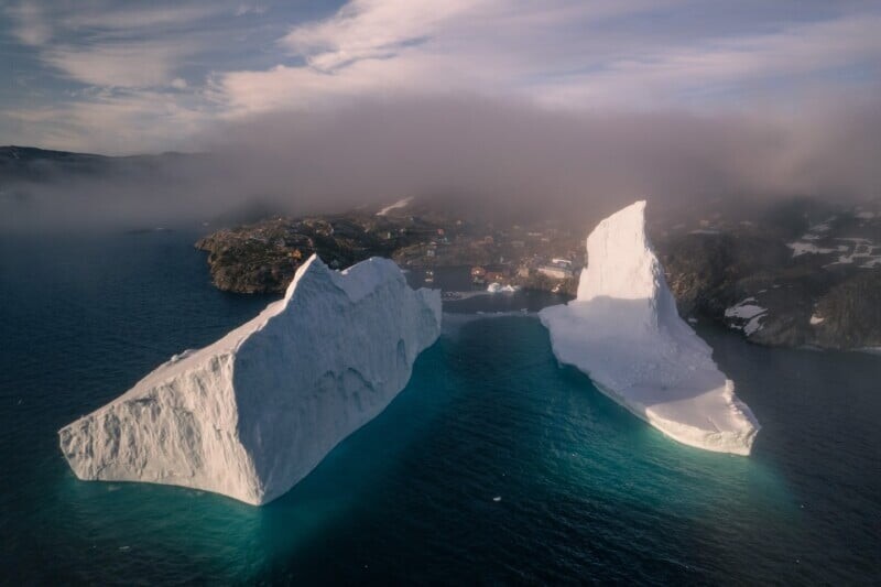- Сюрреалистичные фотографии гигантских айсбергов над крошечной деревней
