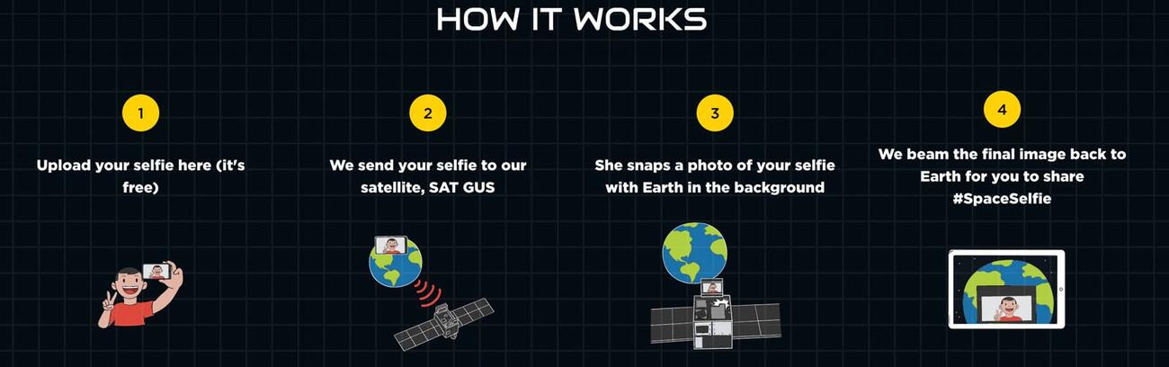 Спутник SAT GUS, движущийся на скорости 17 000 миль в час на высоте 375 миль над Землёй, оснащён системой камеры и дисплея, что позволяет делать уникальные снимки. Пользователи могут загрузить свои селфи, которые затем будут отправлены спутнику и сфотографированы на фоне нашей планеты.