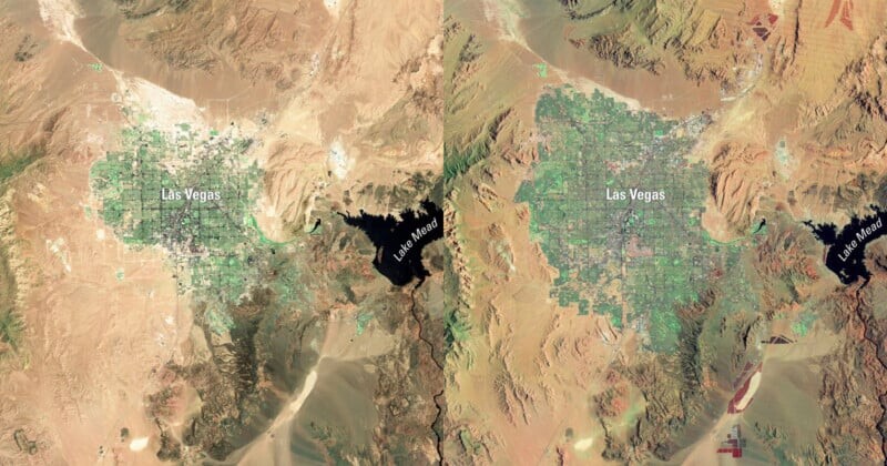 На последнем изображении запечатлены не только Лас-Вегас, но и окружающие его сообщества, такие как Хендерсон и Парадиз, которые разрастаются в пределах пустыни Мохаве. По данным USGS, население региона возросло примерно на 69% с 2000 по 2023 годы, увеличившись с 1,38 миллиона до 2,33 миллиона. В 2025 году ожидается, что это число составит около 2,4 миллионов.