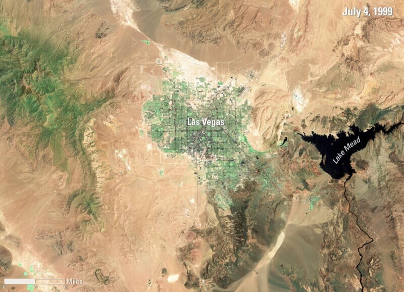 Спутник Landsat 7 завершил свою 25-летнюю программу наблюдения Земли финальным изображением Лас-Вегаса, на котором видно, что город почти удвоился в размерах с момента первого снимка. С момента запуска 15 апреля 1999 года, Landsat 7 зафиксировал более 3,3 миллиона изображений, среди которых было и первое изображение Лас-Вегаса, сделанное в июле 1999 года.