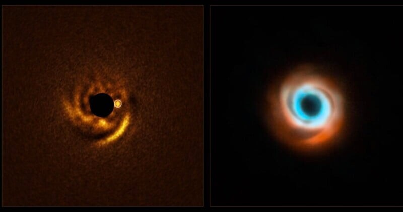 На изображении слева видно, как вокруг молодой звезды HD 135344B может формироваться планета. Звезда окружена диском из пыли и газа с четкими спиральными руками. Ученые считают, что эти спирали образуются благодаря молодым планетам — вероятная планета находится прямо у основания одной из рук, как и ожидалось.