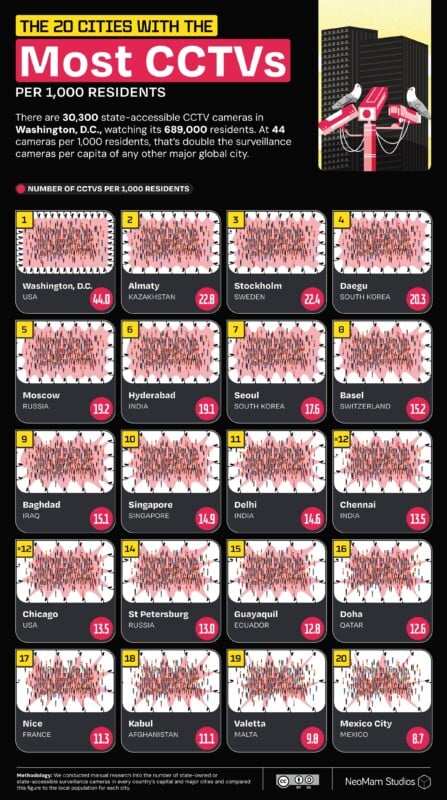 В новом исследовании, проведенном NeoMam Studios, специалисты изучили камеры видеонаблюдения, контролируемые государством или доступные для него в крупных городах по всему миру, рассчитывая количество камер на 1,000 жителей и на квадратный километр. Согласно отчету, Вашингтон, округ Колумбия, возглавляет список самых наблюдаемых городов на Земле.