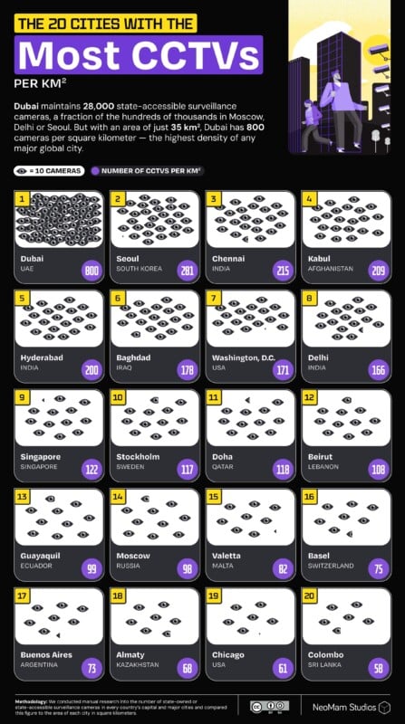 Также было установлено, что Дубай имеет почти в три раза больше камер на квадратный километр, чем любой другой город. Вашингтон имеет 171 камеру на км² — больше, чем в Сингапуре, Дохе или Москве, но плотность Дубая достигает 800 камер/km², за которым следуют Сеул с 281 камерами/km².