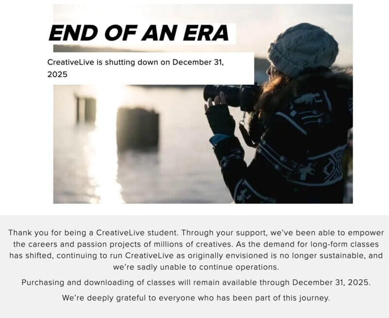 CreativeLive, одна из первых платформ для онлайн-образования в области фотографии, объявила о закрытии. До конца года сайт будет доступен только для текущих пользователей, а полностью прекратит свою работу 31 декабря 2025 года.