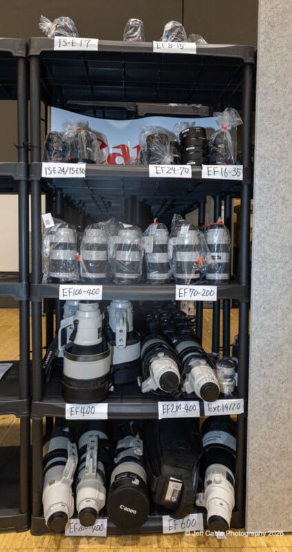 Несмотря на то, что часть оборудования уже была передана фотографам, у CPS оставалось много техники в запасах. В одном из снимков Кейбл запечатлел ряд супер телеобъективов, цена некоторых из которых достигает 20,000 долларов, включая Canon RF 800mm f/5.6 L IS USM.