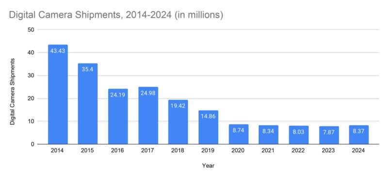 Показатель поставок цифровых камер снизился с рекордов 121,5 миллиона в 2010 году до ожидаемых 8,37 миллиона в 2024 году. Анализ показывает, что спрос на зеркальные камеры (DSLR) стремительно падает, тогда как интерес к беззеркальным камерам (mirrorless) продолжает расти. Эта тенденция, как и другие изменения на рынке, может быть связана с тем, что качество фотографий, создаваемых смартфонами, достигло приемлемого уровня для большинства потребителей.