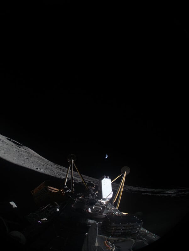 На фотографии отчетливо виден драматичный лунный склон, освещенный тонким солнечным светом, в то время как вдалеке светит полуночный земной полумесяц. В данном положении модуль Athena не способен вырабатывать электроэнергию.