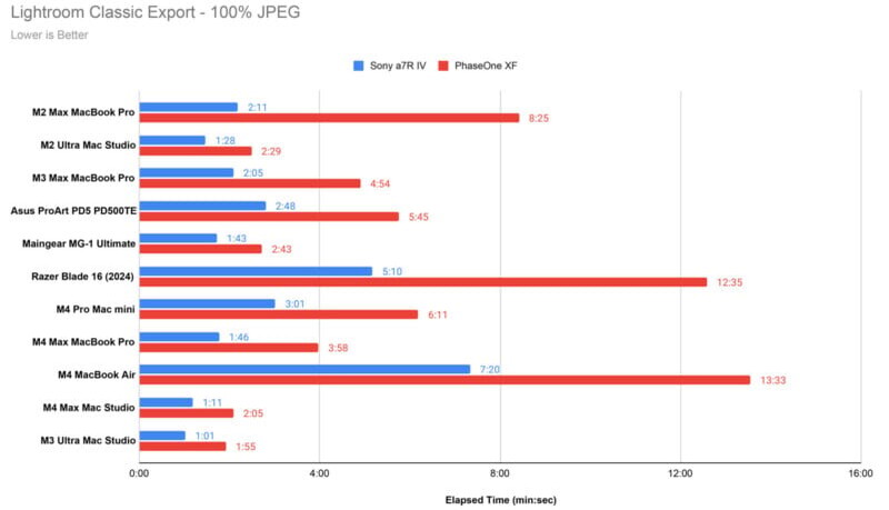 Что касается производительности, важно отметить, что MacBook Air с M4 показывает средние результаты в тестах Lightroom, что может не устроить пользователей, занимающихся большой обработкой фотографий. Однако при обычном редактировании изображений, он вполне адекватен.