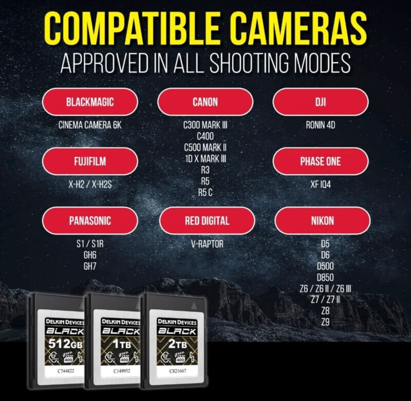 Компания Delkin Devices представила новую серию CFexpress Type B 4.0 карт памяти Black, включая модель VPG 400. Эти карты, доступные в вариантах емкости 512 ГБ, 1 ТБ и 2 ТБ, гарантируют высокую скорость и надежную производительность, что делает их идеальными для профессиональной съемки.