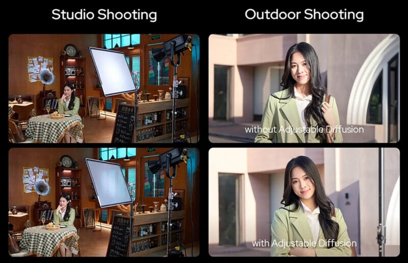 В отличие от статичных пластиковых или тканевых решений, новые панели Godox Knowled AD представляют собой современные электронные устройства, которые останавливаются на разных уровнях диффузии. Таким образом, они могут изменять свое состояние от прозрачного до полностью матового, задавая эффект мягкого освещения.