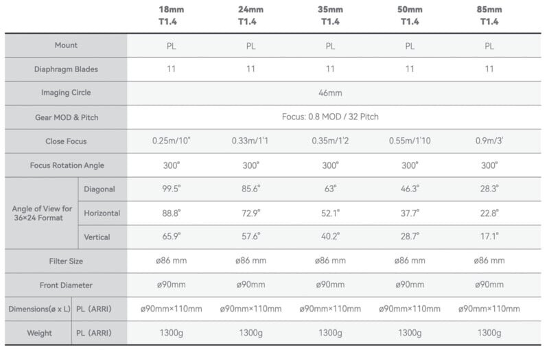 Каждый объектив весит 1,3 кг и покрывает круг изображения диаметром 46 мм, что делает их подходящими для сенсоров Super35, полнокадровых и большого формата. Они имеют одинаковые характеристики, такие как модуль зубчатого колеса 0.8, размер фильтра 86 мм и передний диаметр 90 мм. Кроме того, у них предусмотрена поддержка заднего фильтра, что позволяет использовать небольшие ND или креативные фильтры, что полезно при использовании объективов на стабилизаторе или дроне.
