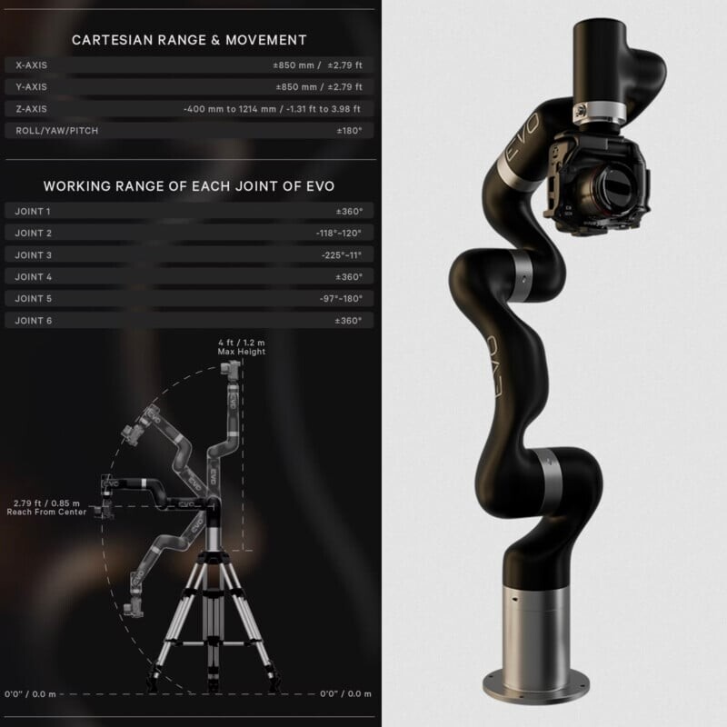При весе всего 20 килограммов (44 фунта) и возможности поддержки полезной нагрузки до 5 килограммов (11 фунтов), Evo идеально подходит для YouTube-контент-производителей, независимых кинематографистов и студий с ограниченным бюджетом. Максимальная высота достигает 1,2 метра, а до центра может подниматься на 0,85 метра.