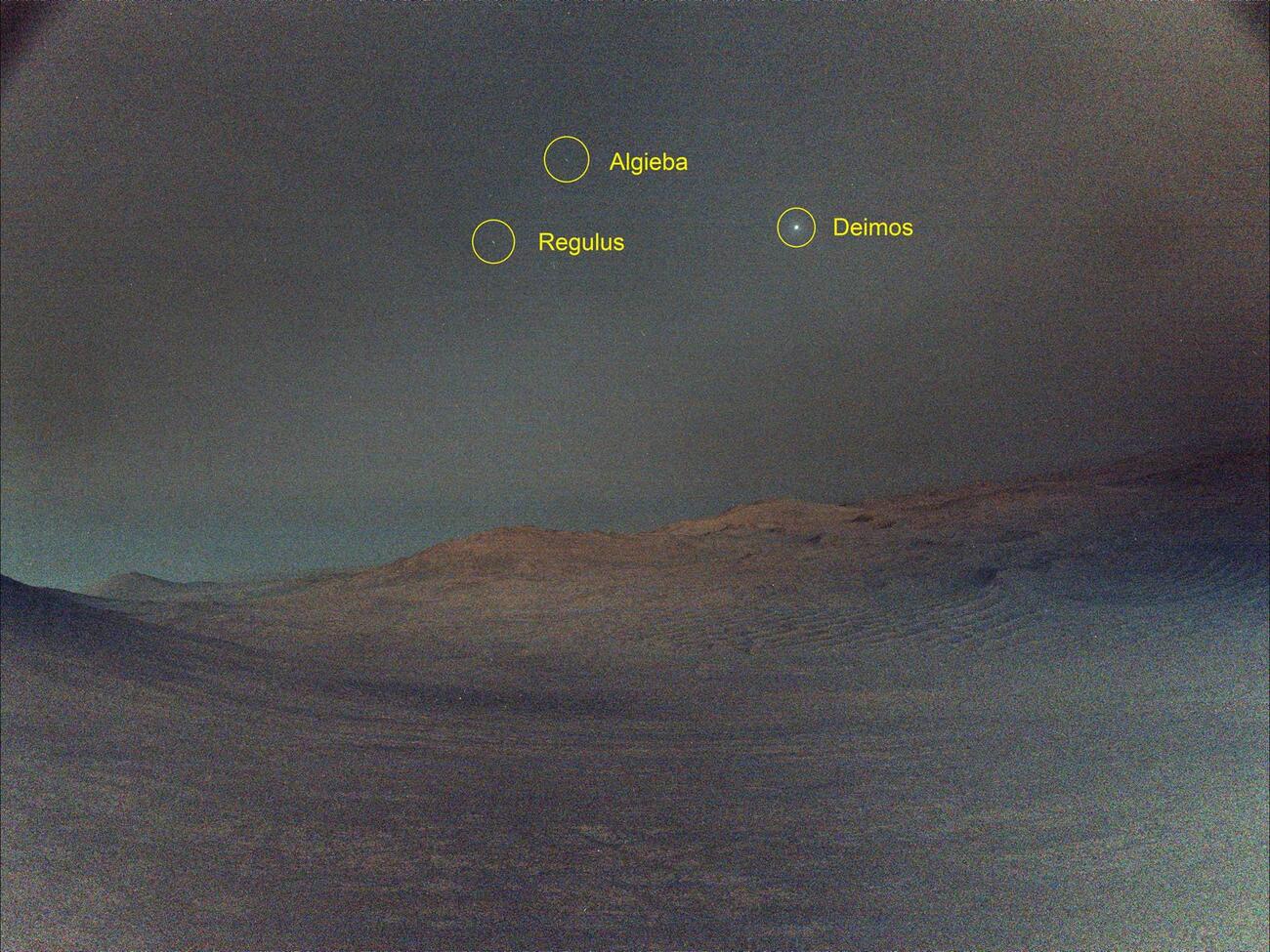 Через сочетание низкой освещенности и длительных экспозиций полученное изображение оказалось довольно шумным, что придает финальному снимку легкую муть. На фото можно увидеть два ярких пятна, которые отмечены как звезды Регулус и Алгеба, принадлежащие созвездию Льва. Ярчайшей точкой на небе, конечно же, является луна Деймос.