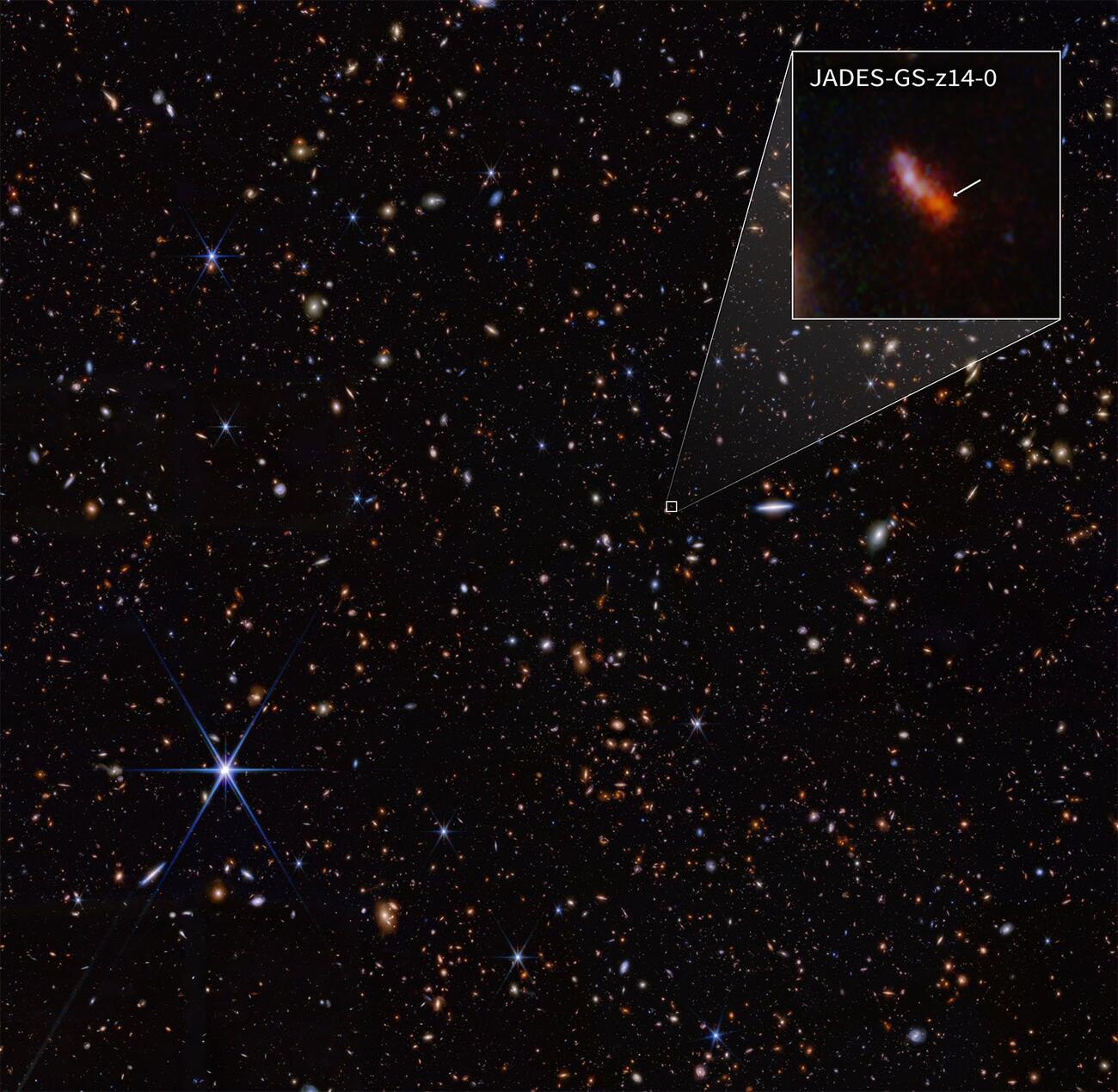Космический телескоп Джеймса Уэбба (JWST) установил новый рекорд. Ученые с его помощью обнаружили свет от древней галактики MoM-z14, появившейся всего через 280 миллионов лет после Большого взрыва. Это самая далекая и старая галактика, когда-либо зафиксированная на фотографиях.