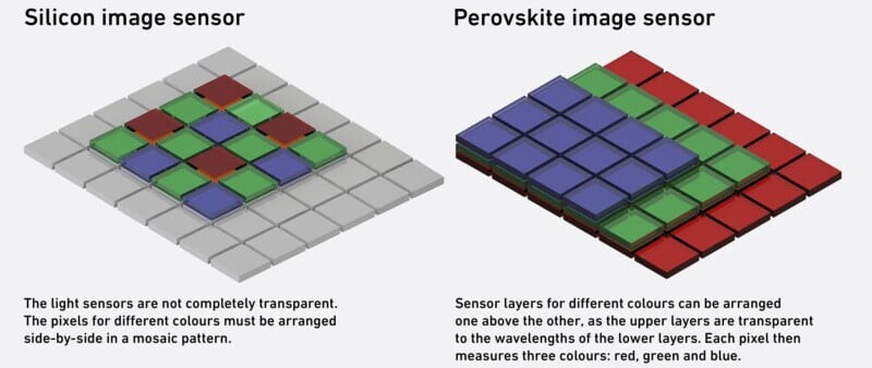 Пареметры сенсора основаны на перовските с добавлением различных химических элементов: немного йода для красного, брома для зеленого и хлора для синего. Это позволяет пикселям располагаться в несколько слоев, а не бок о бок, как это делается в кремниевых сенсорах.