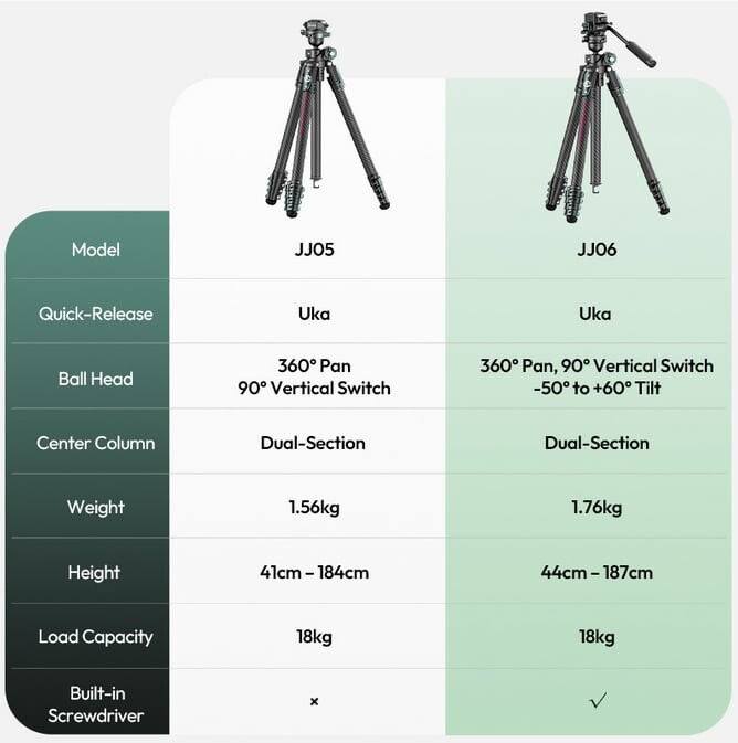 Среди новых продуктов Ulanzi выделяются штативы JJ05 и JJ06, которые обеспечивают множество преимуществ. JJ05 легче и удобнее для съемки на ходу, в то время как JJ06 более оптимизирован для видеосъемки. Тем не менее, оба штатива предлагают функции, которые делают их идеальными для самых разных задач. Независимо от того, снимаете ли вы фотографии, видео или таймлапсы, JJ05 и JJ06 обеспечивают легкость в использовании во всех сценариях съемки.