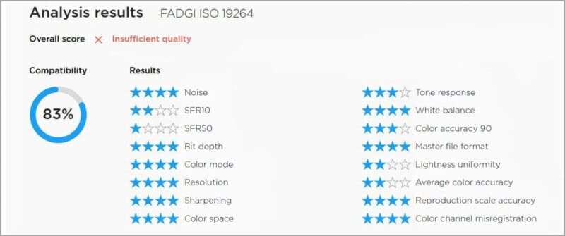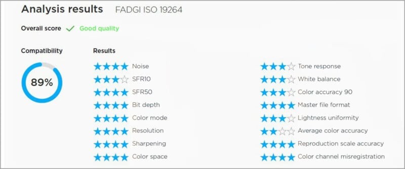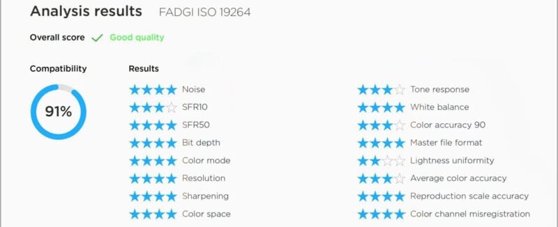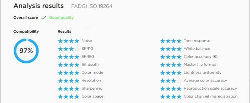 Специалисты применили критерии, которые определяет Инициатива цифровых стандартов федеральных агентств (FADGI). Это позволяет стандартизировать качество изображений по простейшей четырехзвездочной системе оценки, что делает такую проверку более наглядной.
