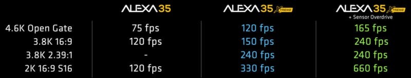 Основная особенность Xtreme заключается в её скорости: камера может записывать со скоростью до 330 кадров в секунду, а в режиме "Sensor Overdrive" — до 660 fps, хотя с потерей динамического диапазона (максимум 11 ступеней). При этом, Alexa 35 Xtreme превосходит стандартную версию в большинстве показателей, например, в 4K Open Gate она может работать на 120 fps без потери динамики, тогда как стандартная версия достигает максимум 75 fps.