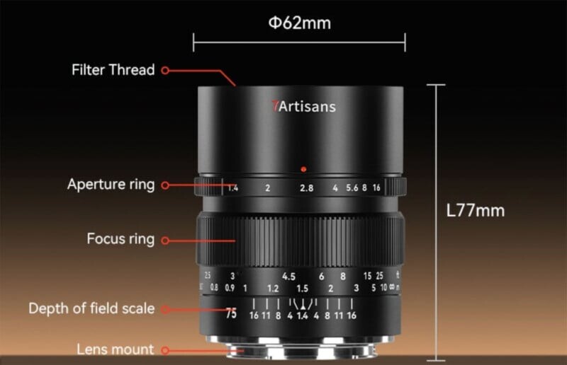 Основная оптика состоит из шести элементов, собранных в шести группах, и обеспечивается 13-лепестковым диафрагмами. 7Artisans обещает "мечтательный бokeh", что с фокусным расстоянием 75 мм будет более заметным по сравнению с 50mm f/1.4.