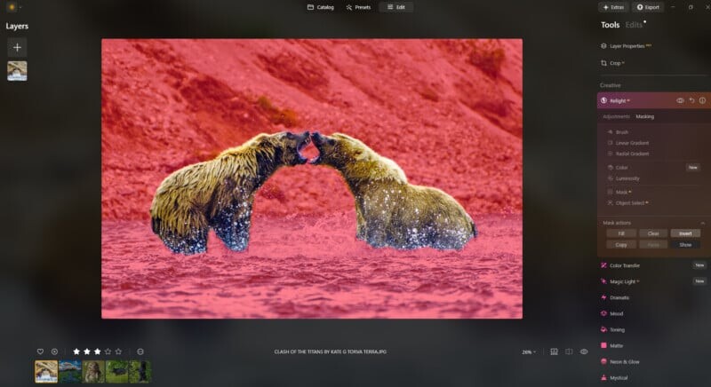 Функция Relight помогает точно управлять источниками света в изображении, добавляя глубину и объем. Данная функция может быть использована для улучшения освещения в портретах и пейзажах, а ее точность позволяет изолировать отдельные области и корректировать их без влияния на другие части изображения.