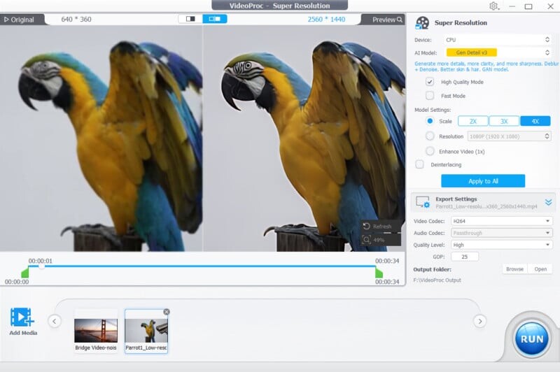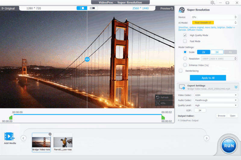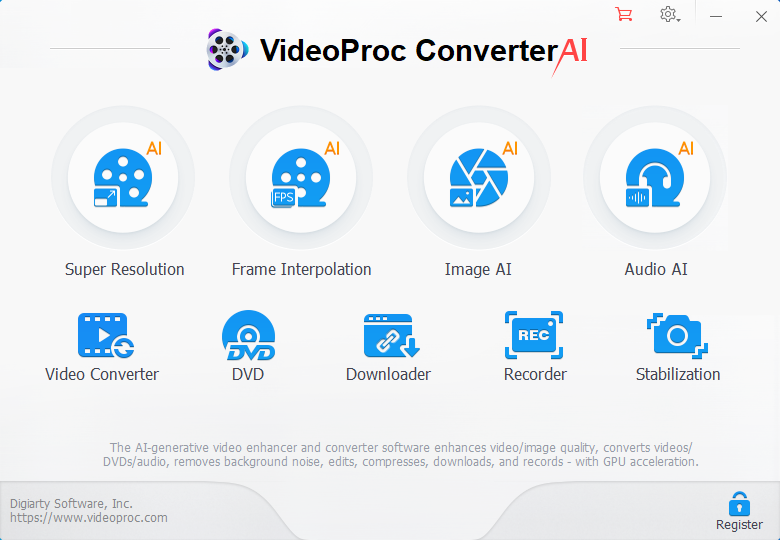 VideoProc Converter AI — это универсальное мультимедийное программное обеспечение, которое включает мощный модуль для улучшения качества видео. С помощью технологий, таких как Super Resolution, Frame Interpolation и Stabilization, программа улучшает старые записи, позволяя им выглядеть как новые. Новые AI модели позволяют достичь впечатляющего качества и быстрой обработки.
