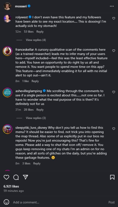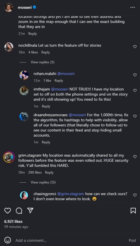 Ответственной за Instagram Адамом Моссери была размещена публикация, в которой он еще раз акцентировал внимание на том, что функция должна активно включаться пользователями. Тем не менее, согласно отзывам пользователей, информация о местоположении отображается даже в случае отключения всех функций, что вызывает явные опасения.