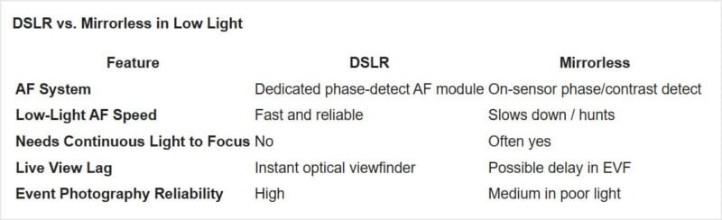 Фотограф с 14-летним стажем, который работал в Бостоне и Остине, делится своим опытом с обоими типами камер. Он отмечает, что беззеркальные модели отлично подходят для съемки в хорошо освещенных условиях, таких как дневной свет и студийная работа. Однако, как только дело доходит до съемок в условиях низкой освещенности, именно DSLR демонстрирует свою эффективность.