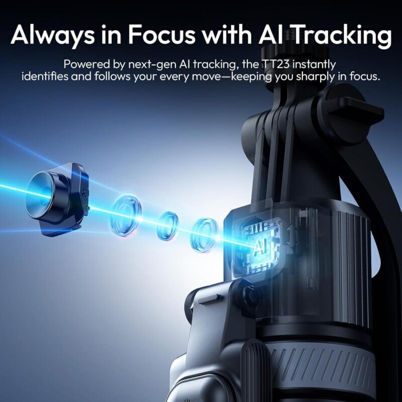 Функция умного следования на 360° ещё более впечатляющая. Вместо традиционных штативов с фиксированным диапазоном отслеживания, TT23 может следить за движениями с любого угла, обеспечивая плавную и стабильную съемку в любых ситуациях.