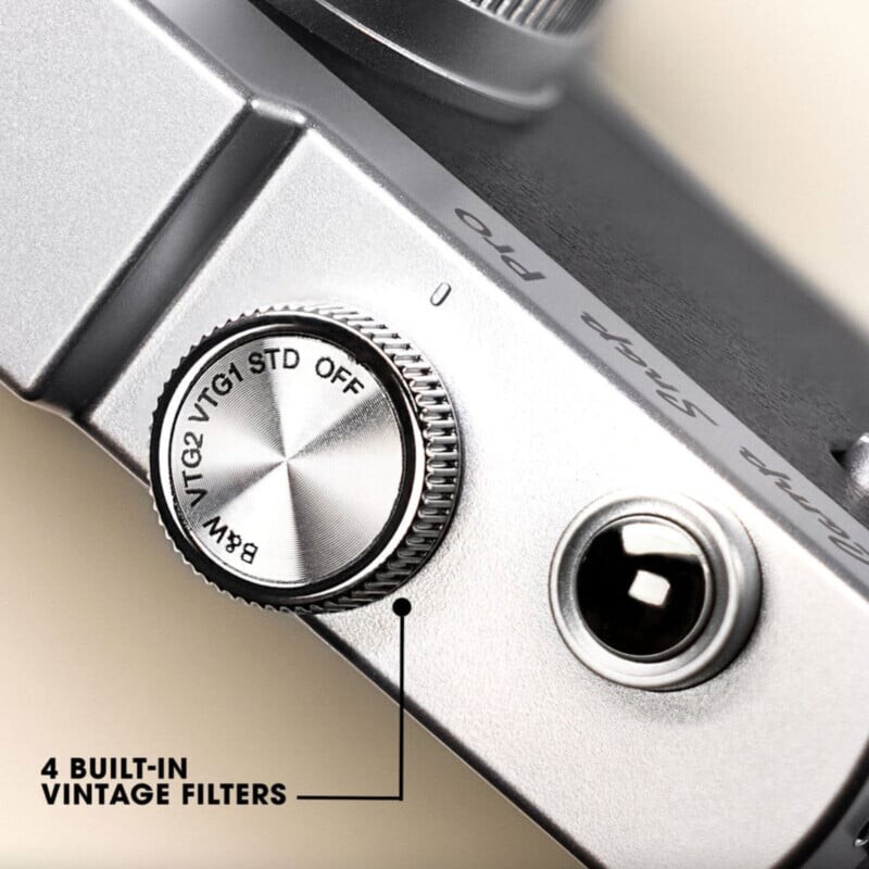 Камера CS-Pro обладает обновленным, но все еще ретро-дизайном в черно-серебристых тонах. Она чуть больше своей предшественницы и продолжает предлагать пользователям знакомый опыт съемки без экрана и с встроенной оптикой. В отличие от оригинальной модели, у новой камеры появился контроллер фильтров в винтажном стиле с четырьмя встроенными фильтрами, вдохновленными пленкой.