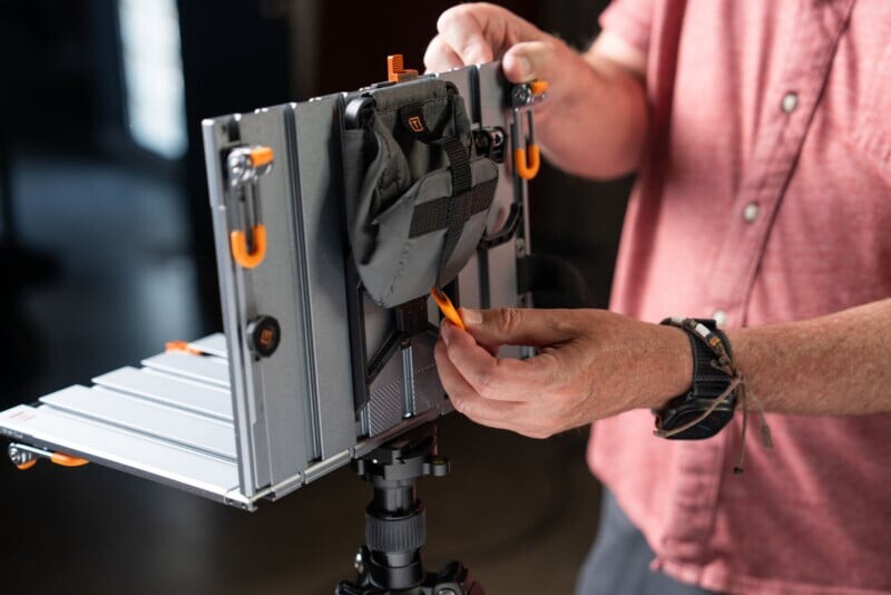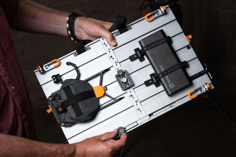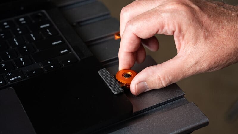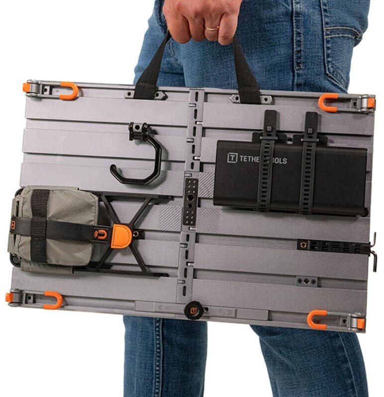 В центре AeroTrac находится его интегрированная трек-система, позволяющая надежно прикреплять ноутбуки, планшеты, внешние накопители, осветительные приборы, и другие аксессуары. Треки устанавливаются как сверху, так и снизу рабочей станции, и все устройства остаются на месте во время установки, демонтажа и транспортировки. Дополнительные резьбовые отверстия 1/4'-20 позволяют фиксировать мониторы, лампы или другие инструменты. Для пользователей, желающих настроить станцию, Tether Tools предлагает файлы 3D-печати для создания персонализированных аксессуаров.