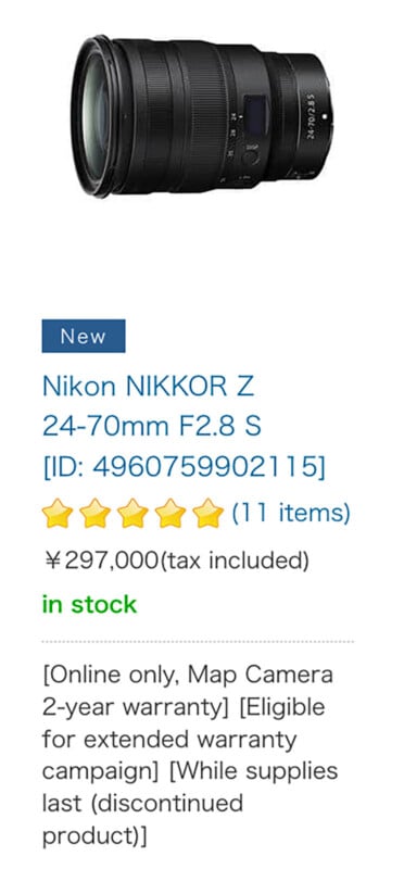 Первоначальные сообщения пришли из Японии, когда один из крупных японских ритейлеров, Yodobashi Camera, пометил оригинальный Nikkor Z 24-70mm f/2.8 S, выпущенный в 2019 году, как «снятый с производства». Магазин Map Camera также обозначил, что производство этого объектива завершено, хотя другие ритейлеры не упомянули статус производства.