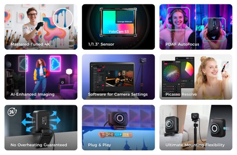 YoloCam S3 может транслировать 4K видео со скоростью до 30 кадров в секунду и Full HD до 60 кадров в секунду. Она включает фазовый автофокус, детекцию лиц, ручные настройки и поддержку HDR. Кроме этого, камера использует AI для автоматического выбора экспозиции, баланса белого и снижения шума.