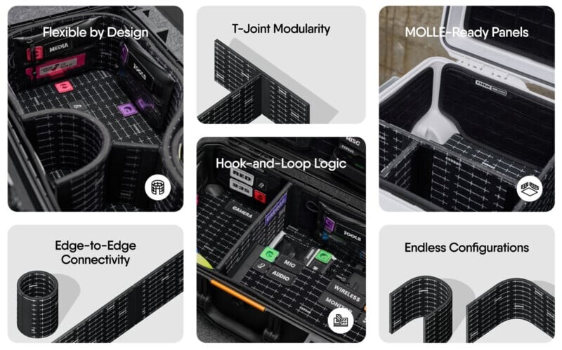 В отличие от традиционных систем перегородок, которые работают только с прямыми линиями, пользователи могут настраивать перегородки, создавая U- и S-образные формы, а также уголки. Это позволяет создавать индивидуальные отсеки внутри жестких корпусов для любой техники, включая объективы, что помогает максимально использовать пространство и обеспечивать надежную защиту.