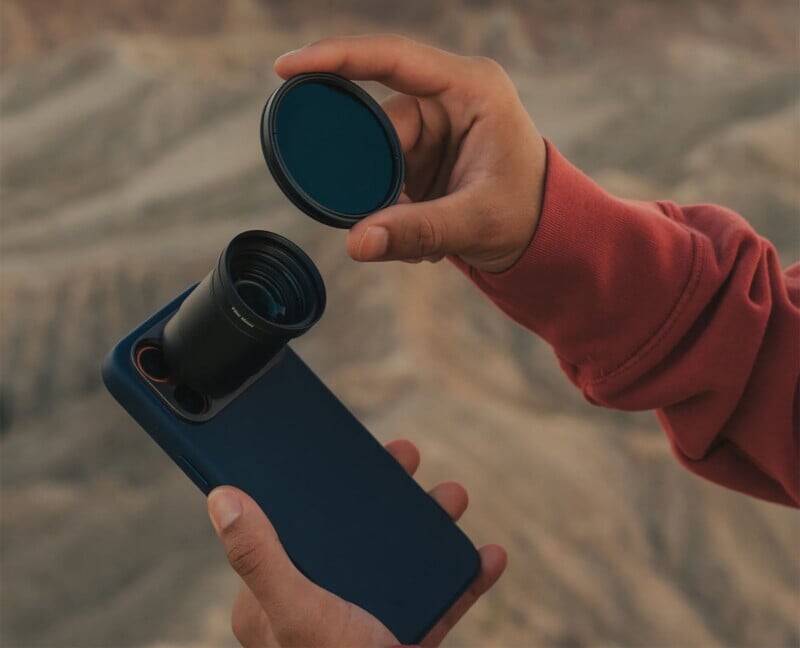 Объектив на 48 мм прикручивается к iPhone вместе с одним из специализированных чехлов Sandmarc или может быть установлен с помощью клипсы. Он поддерживает 43 мм фильтры, что позволяет использовать различные фильтры Sandmarc, включая переменные НД и специальные эффектные фильтры.