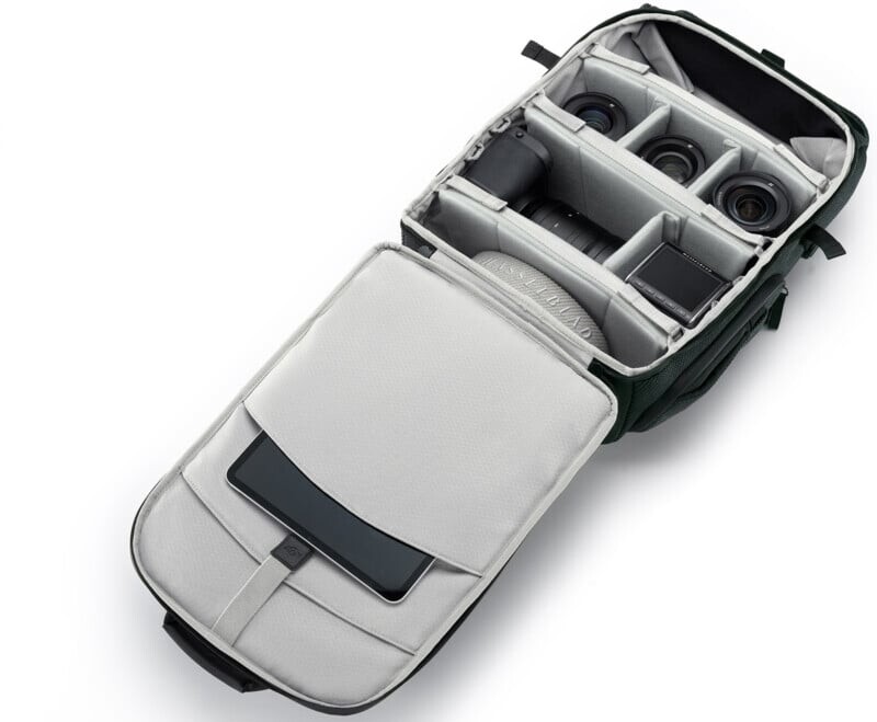 Рюкзак имеет объем около 20 литров, что позволяет удобно разместить в нем камеру Hasselblad, два объектива, а также ноутбук и другие необходимые аксессуары. Интерьер рюкзака включает три съемных перегородки, что позволяет гибко организовывать пространство. При этом его вес составляет около 2.35 килограмма.