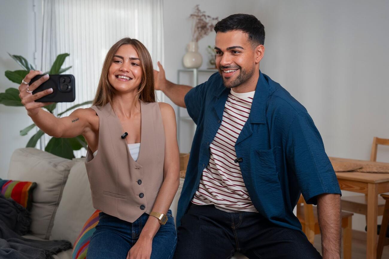Two young adults smiling and taking a selfie outdoors, with green hills and trees in the background on a sunny day.