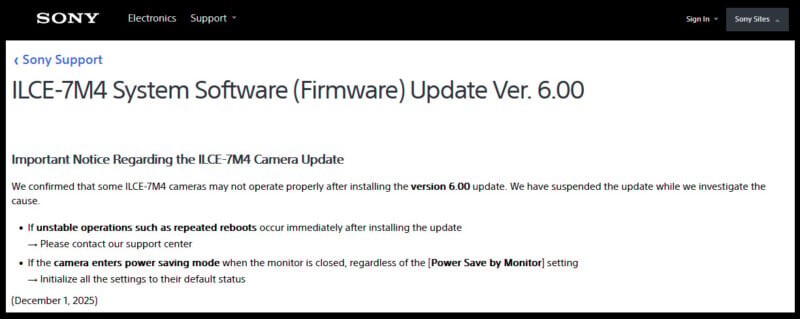 Решение о приостановке обновления стало ответом на сообщения пользователей о значительной нестабильности работы камеры после установки прошивки. Sony рекомендует всем владельцам a7 IV, которые уже установили обновление и столкнулись с проблемами, обратиться в службу поддержки компании.