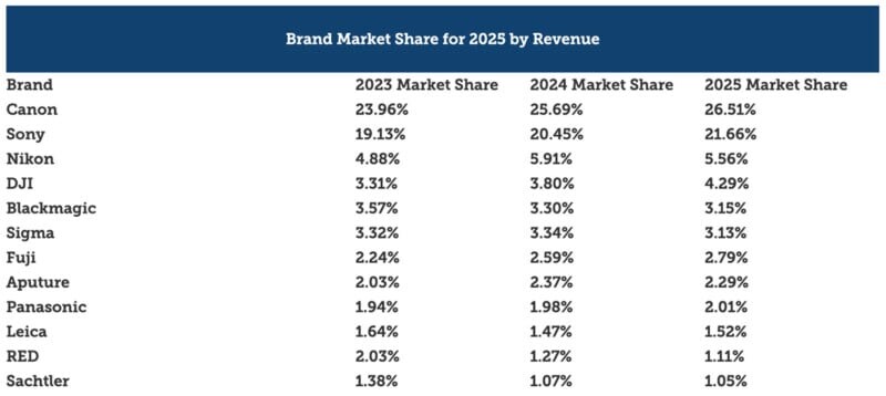 Lensrentals также представил данные о доле рынка по брендам, где Canon и Sony продолжают уверенно удерживать свои позиции, а Nikon значительно отстает.